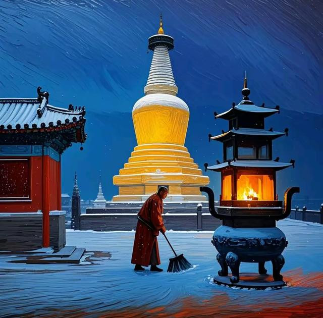 僧东谈主通过这一苟简的行动,拂去的不仅是地上的积雪,更是内心的杂念与污垢。