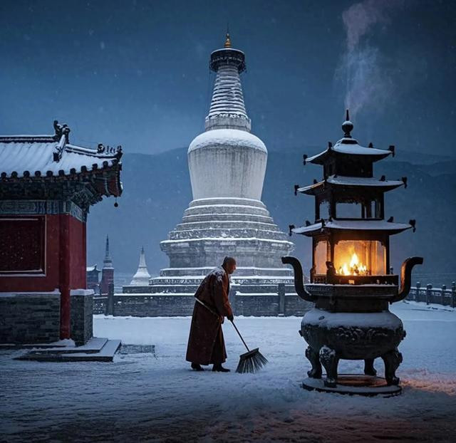 一位身着褐色僧袍的僧东谈主,手执扫帚,方法宁静而专注,渐渐清扫着庭院中的积雪。