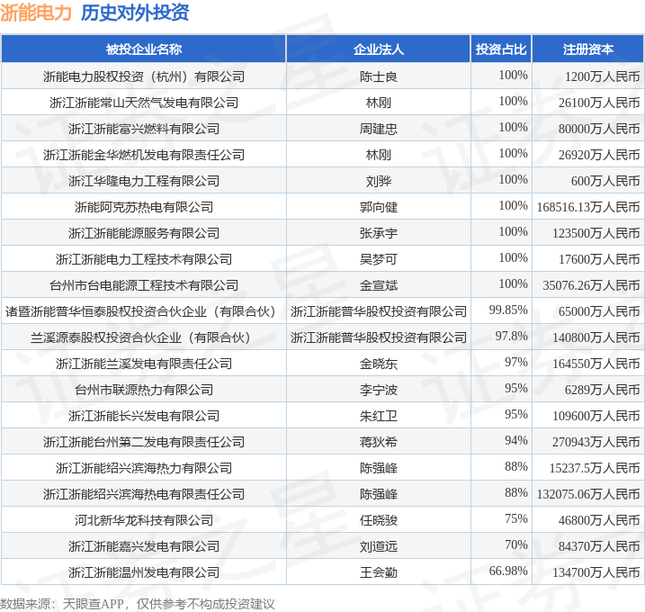 本站音书,确认天眼查APP泄漏,浙能电力(600023.SH)新增沿路对外投资事件,被投资公司为中核浙能动力有限公司买球下单平台,法定代表东说念主钟华,投资占比为-。该公司从事电力、热力坐蓐和供应业,注册成本为262768.6275万东说念主民币。现在,浙能电力共存在对外投资85项,投资占比前20的气象见下表: