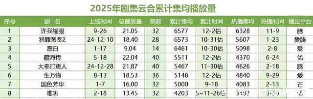 以上等于2025年集均播放量前十的电视剧盘货了。天然这些剧集作风分辩,然则能登上这份榜单,就讲明有它的出彩之处。淌若您最近感到“剧荒”,不妨试着看一看,没准就有你可爱的类型呢。