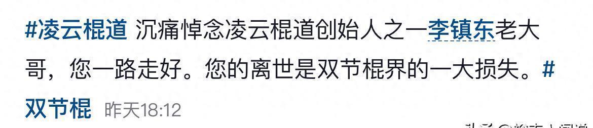 11月15号买球下单平台,有多位圈内的网友共享悲痛音信,中国武汉凌云棍谈俱乐部首创东谈主李镇东逝世,年仅39岁。
