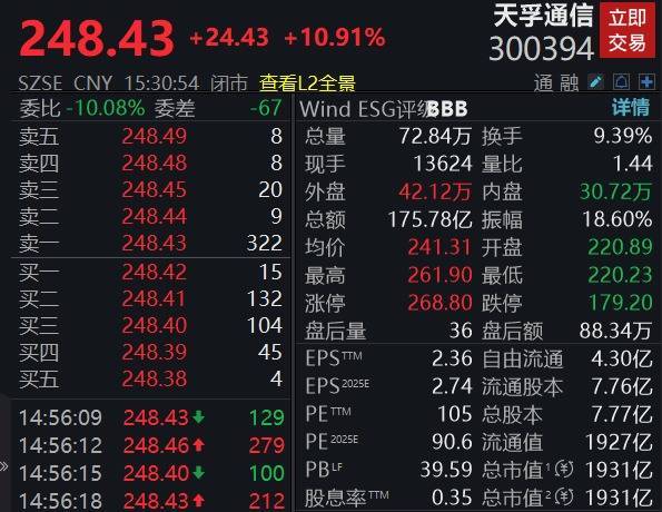1月30日收盘,天孚通讯股价大涨10.91%,报248.43元/股,总市值为1931亿元。股价近一年来已累计高潮近247%。