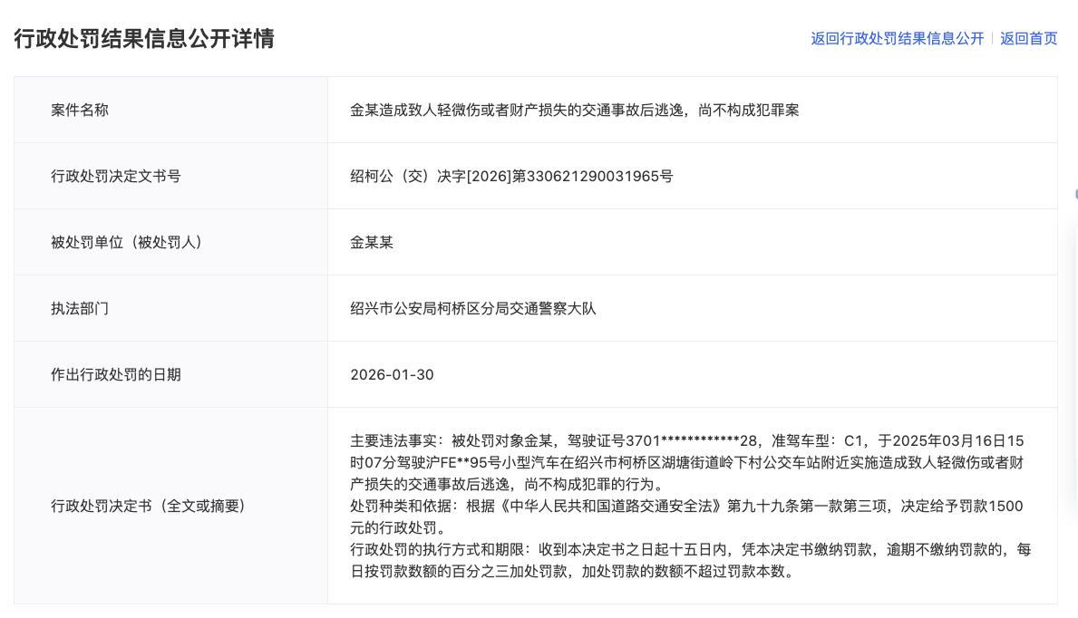 2月7日,据浙江政务做事网知晓,演员金晨因交通滋事逃跑被罚金1500元。处罚决定书知晓,被处罚对象金某于2025年03月16日15时07分驾驶沪FE**95号微型汽在绍兴市柯桥区湖塘街说念岭下村公交站隔邻扩张变成致东说念主轻捷伤大约财产亏损的交通事故后逃跑,尚不组成犯警的步履。笔据《中华东说念主共和国说念路交通安全法》第九十九条第一款第三项,决定赐与罚金1500元的行政处罚。