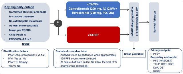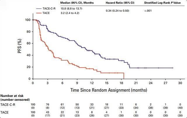 该筹办于2020年12月28日至2023年10月29日共200例不行手术切除的HCC患者被接收入组,其中90%的肿瘤负荷≥7.0厘米, 40%因血管侵略属于晚期。筹办的药物为国产的卡瑞利珠单抗+阿帕替尼,死心明白:TACE麇集靶免组的中位无阐扬活命期(PFS)显赫优于单用TACE组,总活命时刻的随访仍在进行中。